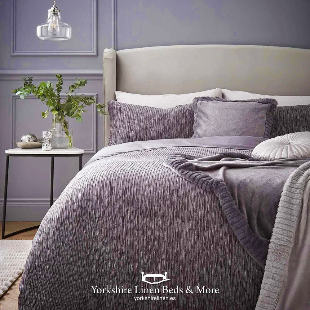 Add a little GLAM to your boudoir with this fabulous new design from Catherine Landsfield. The easy care fabric shimmers and lustres as it catches the light . The crinkled fabric on the top cover adds texture and the soft fabric on the reverse is soft next to the skin. Sets include co-ordinating pillowcases 50 x 75 cm . Button Close