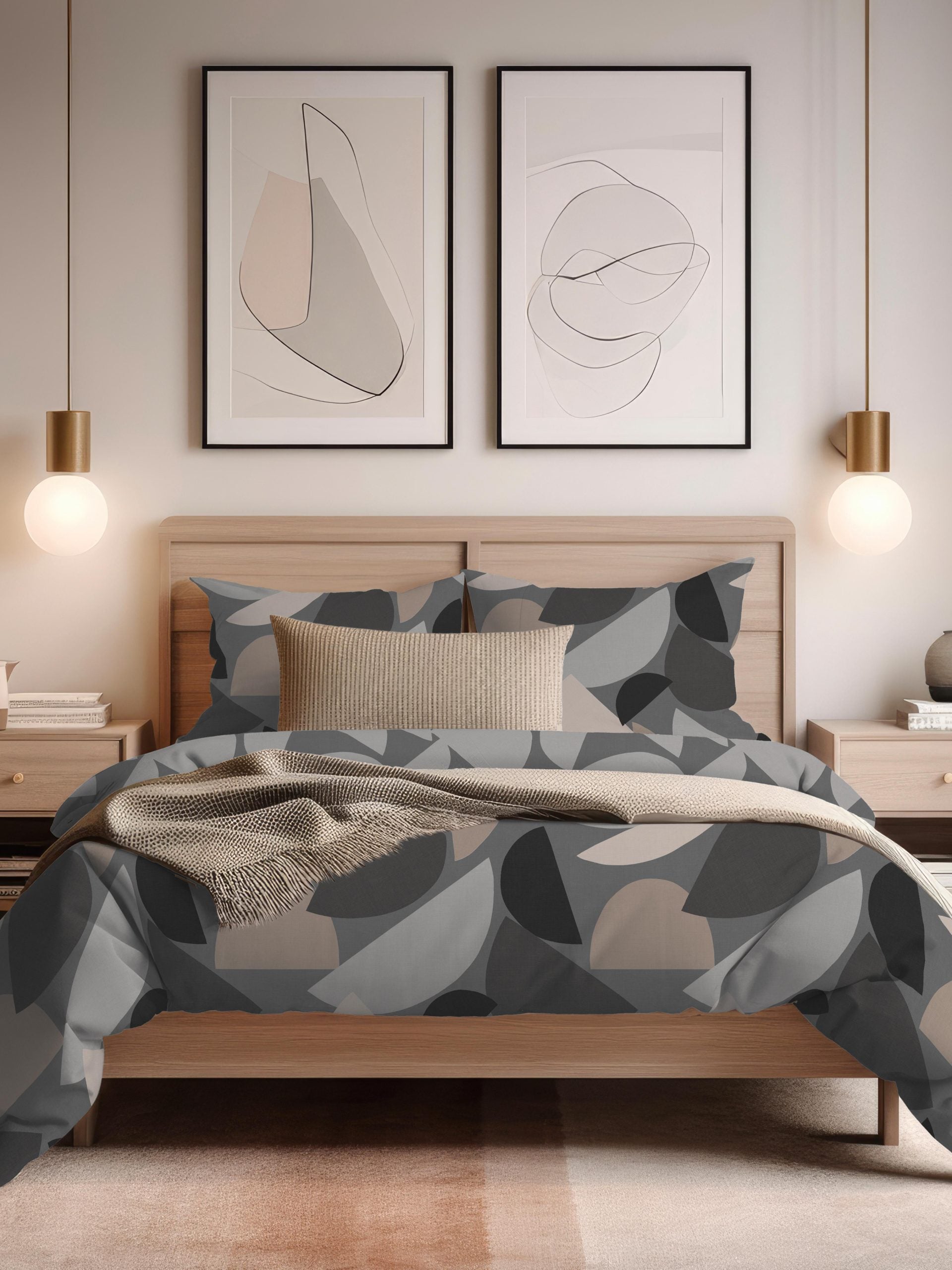 Boden Abstract Duvet Set, Charcoal. These are super trendy! Abstract artwork and design are a huge vibe in home fashion at the moment and Boden does not fail to disappoint! Stone, Silver and Black shapes on a Charcoal base. The fabric is a lovely quality ‘easy-care’ blend. Sets include pillowcases 50 x 75cm (one pillowcase in a single set and two in all other sizes).