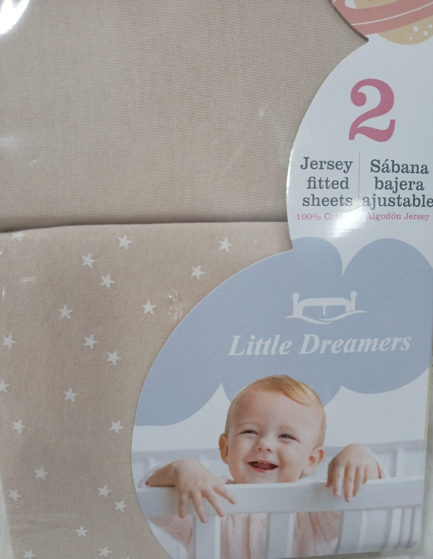 Little Dreamers Organic Stretch Jersey Cot Sheets 2 PK Beige. 100% organic jersey cotton cot sheets from our 'Little Dreamers' range. These are products hand picked by the mummies here at Yorkshire Linen Beds & More to provide maximum comfort, softness and durability. Available in three sizes: Travel Cot, COT and Cot Bed, and three colours: beige, silver & white, these sheets are fully elasticated with a little stretch in the material so they will fit the mattress snuggly. The two packs have a plain sheet and a sheet patterned with stars.