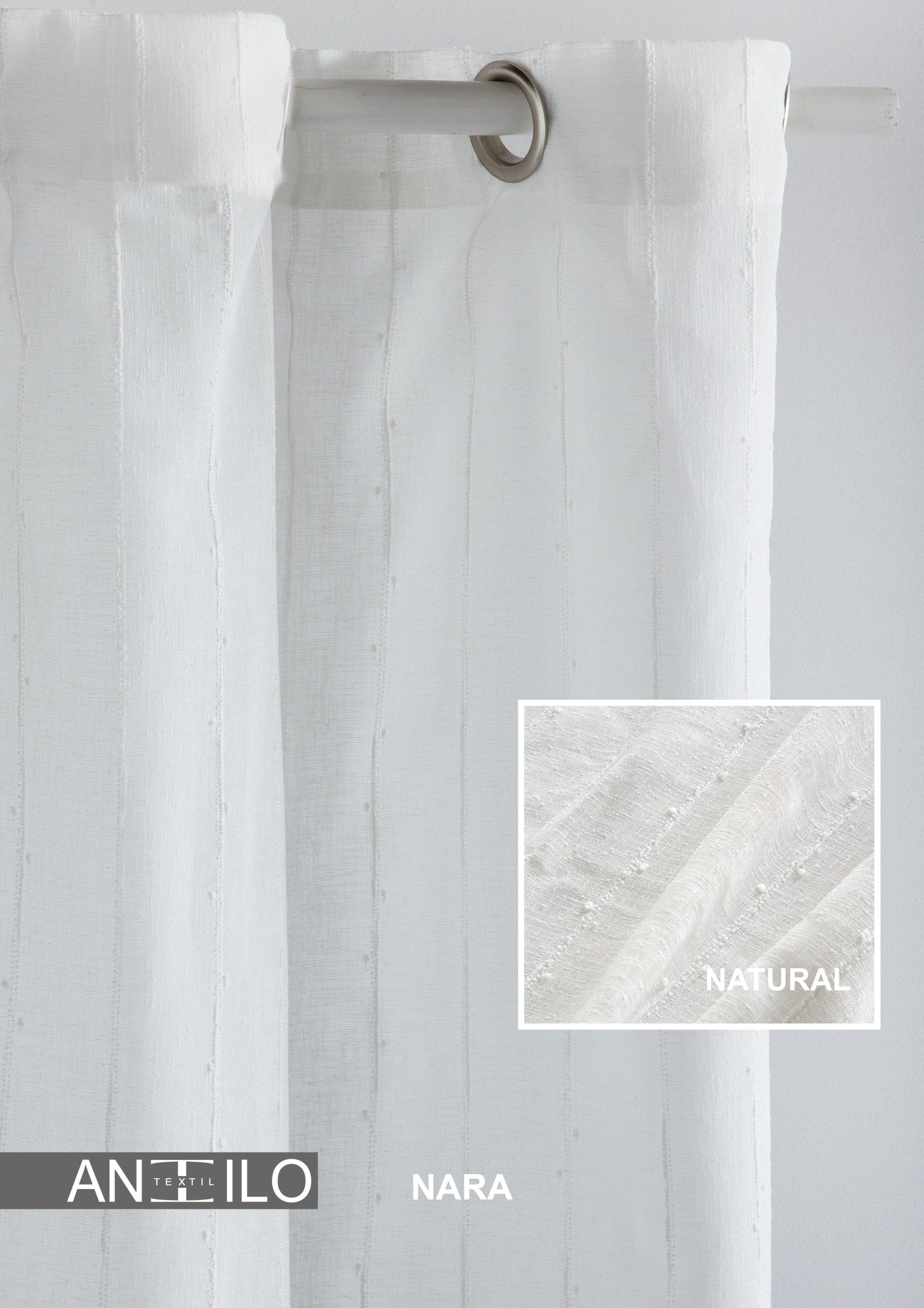 Nara Linen Style Eyelet Voile, Natural. Featuring a tufted vertical line and tiny pom-poms, our Nara Linen-Style Eyelet Voiles are a delight of textures on a linen background. The off-white, natural colour will look light and airy, adding some shade but allowing a flow of air. The length overall is 270cm and we have three width sizes to choose from. Satin silver eyelet header. Sold as single panels.